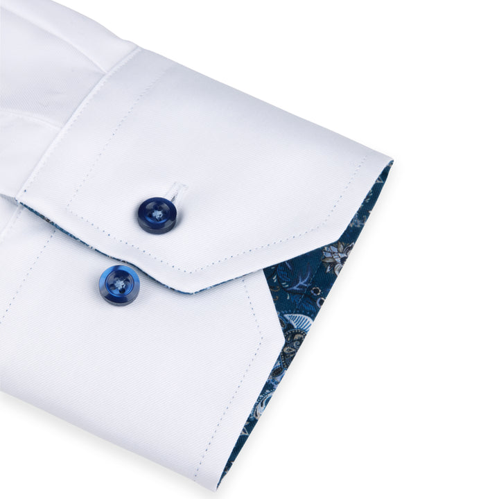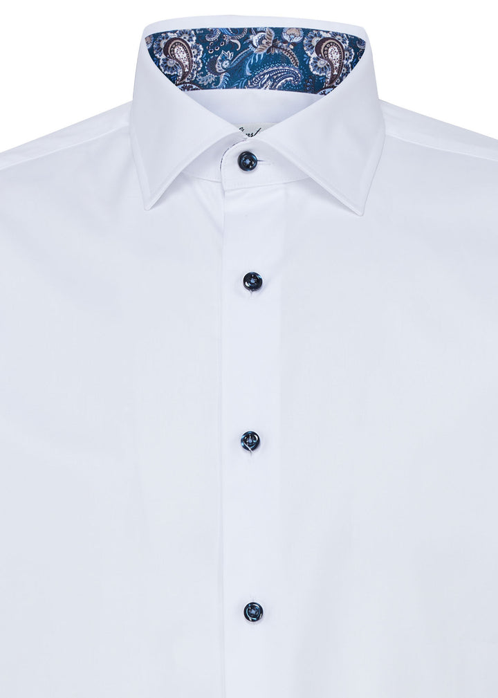 This white twill shirt is detailed with a patterned contrast fabric inside collar and cuffs. Finished with a cut-away collar, single adjustable cuffs and mother of pearl buttons. Wear it under a knitted sweater or as it is, tucked into your favourite pair of tailored pants.